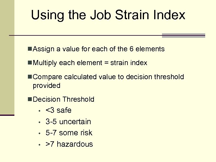 Using the Job Strain Index n Assign a value for each of the 6 elements n Multiply each element = strain index n Compare calculated value to decision threshold provided n Decision Threshold • • <3 safe 3 -5 uncertain 5 -7 some risk >7 hazardous