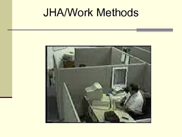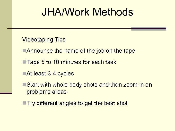 JHA/Work Methods Videotaping Tips n Announce the name of the job on the tape n Tape 5 to 10 minutes for each task n At least 3 -4 cycles n Start with whole body shots and then zoom in on problems areas n Try different angles to get the best shot