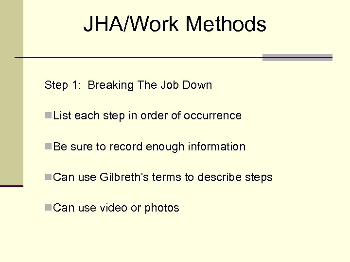 JHA/Work Methods Step 1: Breaking The Job Down n List each step in order of occurrence n Be sure to record enough information n Can use Gilbreth’s terms to describe steps n Can use video or photos