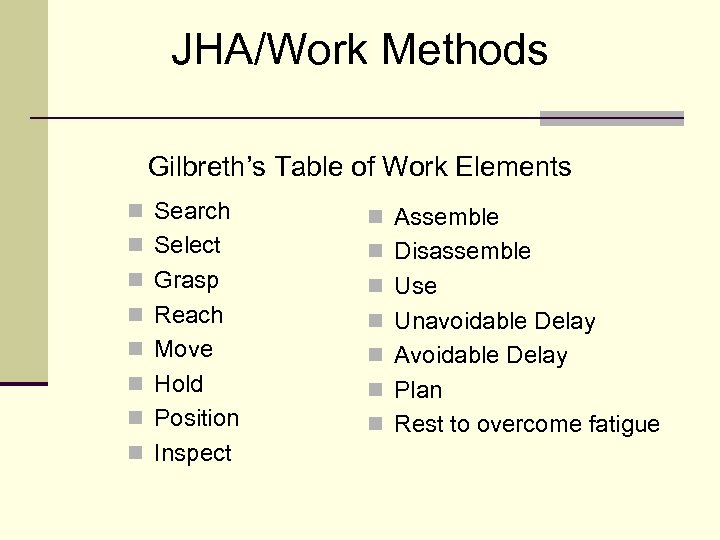 JHA/Work Methods Gilbreth’s Table of Work Elements n Search n Assemble n Select n Disassemble n Grasp n Use n Reach n Unavoidable Delay n Move n Avoidable Delay n Hold n Plan n Position n Rest to overcome fatigue n Inspect