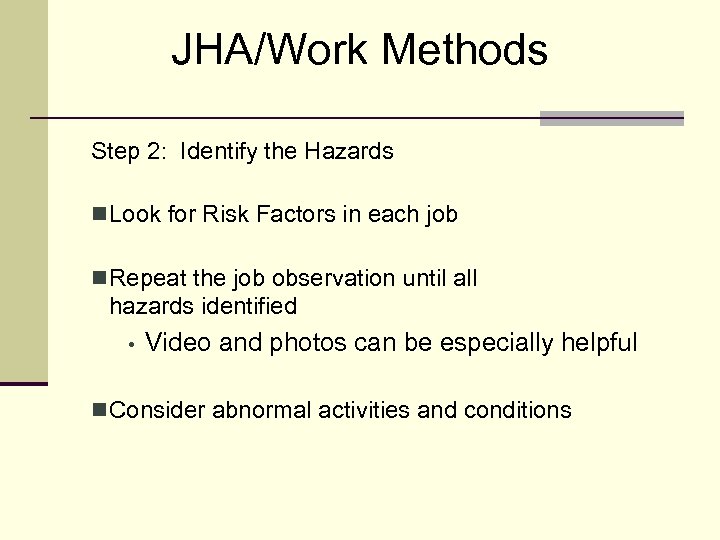 JHA/Work Methods Step 2: Identify the Hazards n Look for Risk Factors in each job n Repeat the job observation until all hazards identified • Video and photos can be especially helpful n Consider abnormal activities and conditions