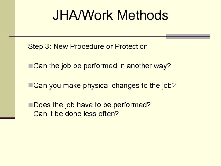 JHA/Work Methods Step 3: New Procedure or Protection n Can the job be performed in another way? n Can you make physical changes to the job? n Does the job have to be performed? Can it be done less often?