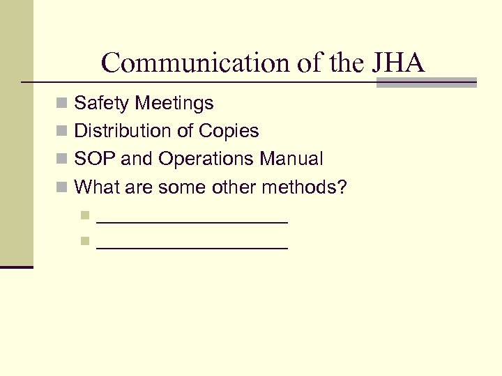 Communication of the JHA n Safety Meetings n Distribution of Copies n SOP and Operations Manual n What are some other methods? n ___________________