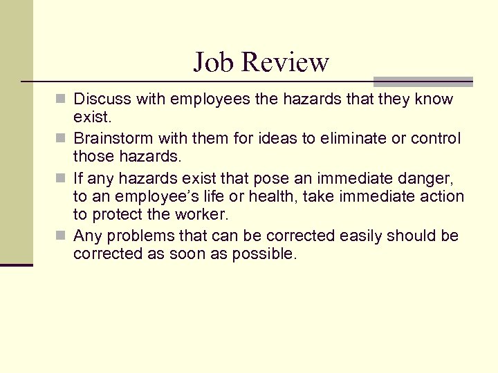 Job Review n Discuss with employees the hazards that they know exist. n Brainstorm with them for ideas to eliminate or control those hazards. n If any hazards exist that pose an immediate danger, to an employee’s life or health, take immediate action to protect the worker. n Any problems that can be corrected easily should be corrected as soon as possible.