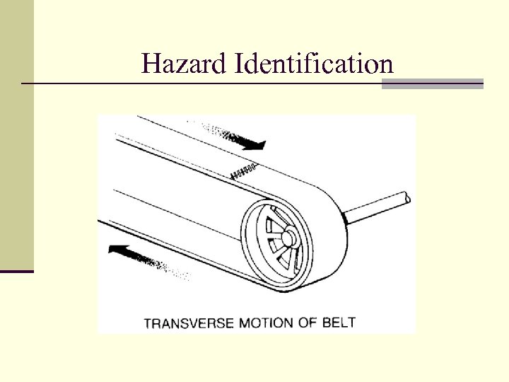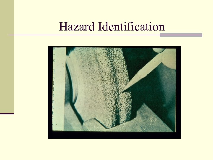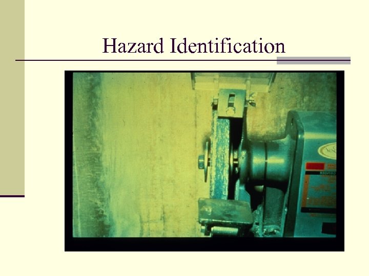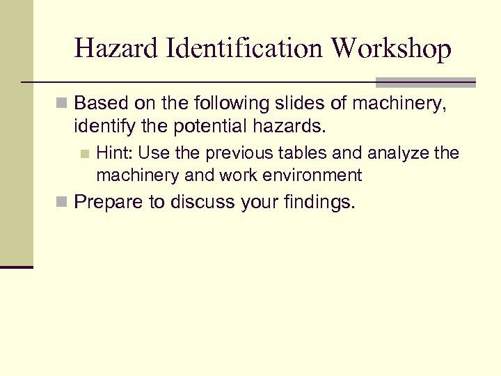 Hazard Identification Workshop n Based on the following slides of machinery, identify the potential hazards. n Hint: Use the previous tables and analyze the machinery and work environment n Prepare to discuss your findings.
