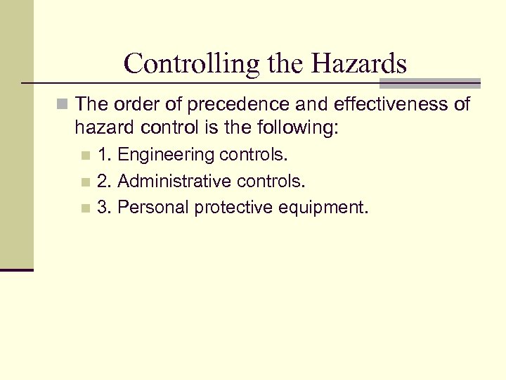 Controlling the Hazards n The order of precedence and effectiveness of hazard control is the following: 1. Engineering controls. n 2. Administrative controls. n 3. Personal protective equipment. n