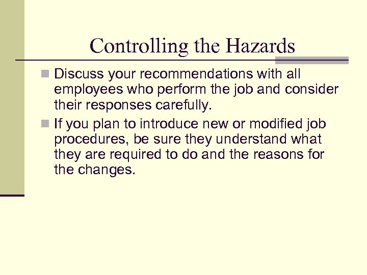 Controlling the Hazards n Discuss your recommendations with all employees who perform the job and consider their responses carefully. n If you plan to introduce new or modified job procedures, be sure they understand what they are required to do and the reasons for the changes.