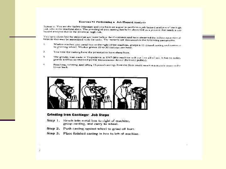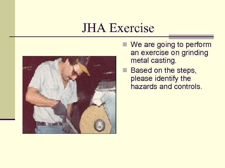 JHA Exercise n We are going to perform an exercise on grinding metal casting. n Based on the steps, please identify the hazards and controls.