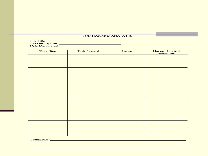 Job Hazard Analysis n Performing a job hazard analysis is one of the best methods to develop safe work procedures for the equipment that is operated. n The JHA can also be used to train employees in the hazards associated with task and what control measures should be practiced.