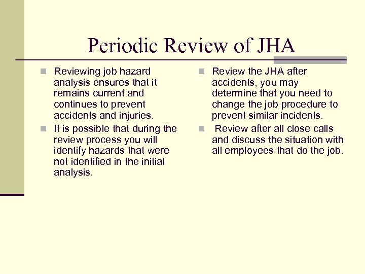 Periodic Review of JHA n Reviewing job hazard analysis ensures that it remains current and continues to prevent accidents and injuries. n It is possible that during the review process you will identify hazards that were not identified in the initial analysis. n Review the JHA after accidents, you may determine that you need to change the job procedure to prevent similar incidents. n Review after all close calls and discuss the situation with all employees that do the job.