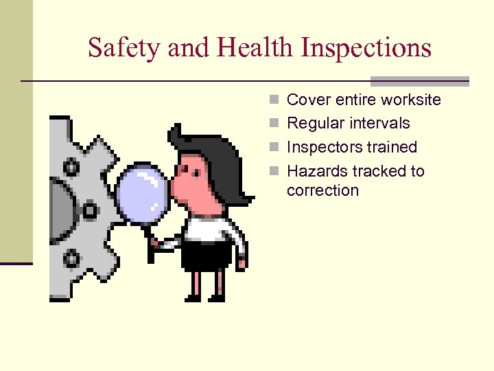 Safety and Health Inspections n Cover entire worksite n Regular intervals n Inspectors trained n Hazards tracked to correction