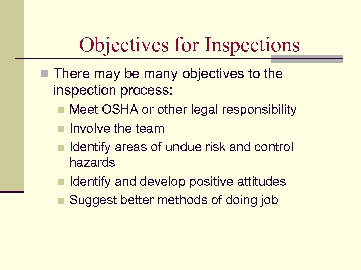 Objectives for Inspections n There may be many objectives to the inspection process: Meet OSHA or other legal responsibility n Involve the team n Identify areas of undue risk and control hazards n Identify and develop positive attitudes n Suggest better methods of doing job n