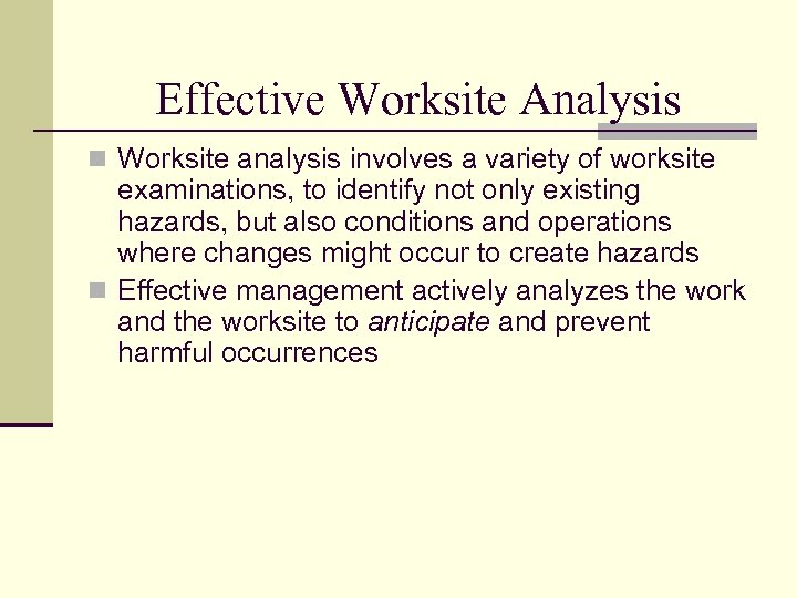 Effective Worksite Analysis n Worksite analysis involves a variety of worksite examinations, to identify not only existing hazards, but also conditions and operations where changes might occur to create hazards n Effective management actively analyzes the work and the worksite to anticipate and prevent harmful occurrences