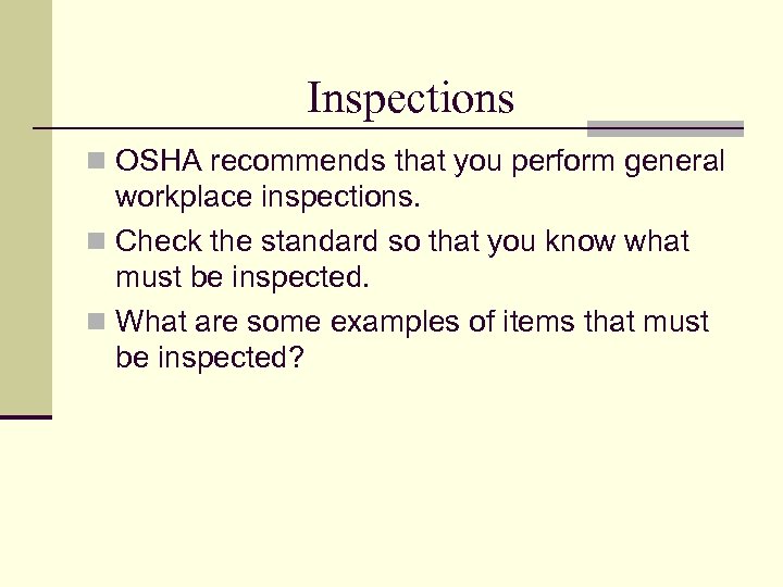 Inspections n OSHA recommends that you perform general workplace inspections. n Check the standard so that you know what must be inspected. n What are some examples of items that must be inspected?