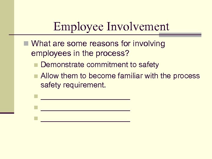 Employee Involvement n What are some reasons for involving employees in the process? Demonstrate commitment to safety n Allow them to become familiar with the process safety requirement. n _____________________ n