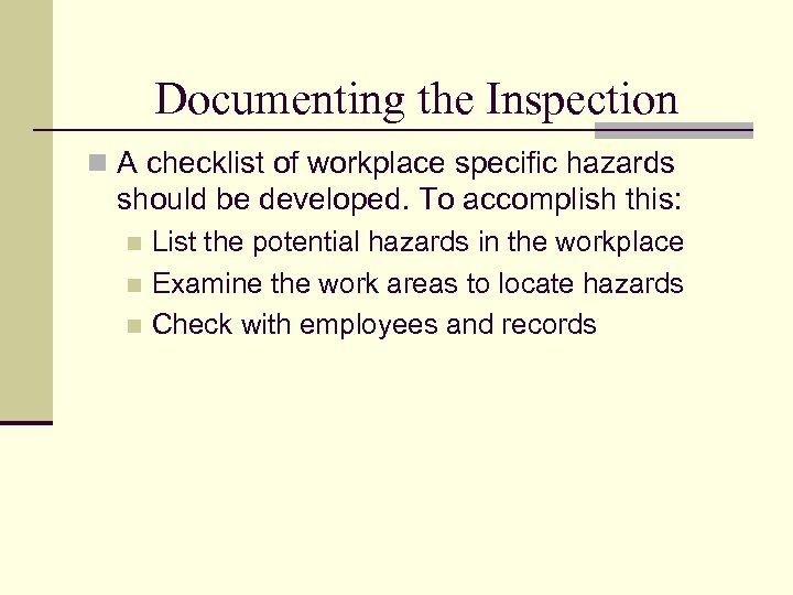 Documenting the Inspection n A checklist of workplace specific hazards should be developed. To accomplish this: List the potential hazards in the workplace n Examine the work areas to locate hazards n Check with employees and records n