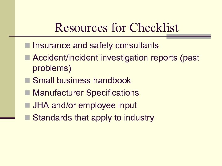 Resources for Checklist n Insurance and safety consultants n Accident/incident investigation reports (past problems) n Small business handbook n Manufacturer Specifications n JHA and/or employee input n Standards that apply to industry