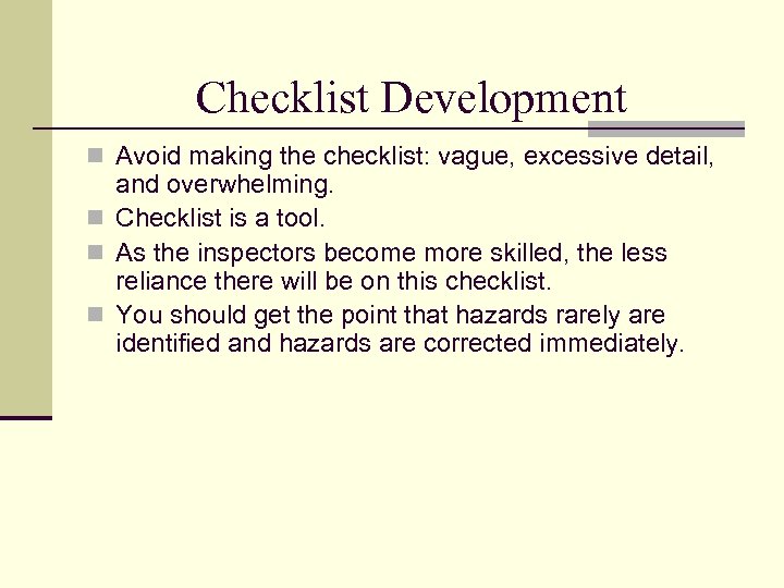 Checklist Development n Avoid making the checklist: vague, excessive detail, and overwhelming. n Checklist is a tool. n As the inspectors become more skilled, the less reliance there will be on this checklist. n You should get the point that hazards rarely are identified and hazards are corrected immediately.