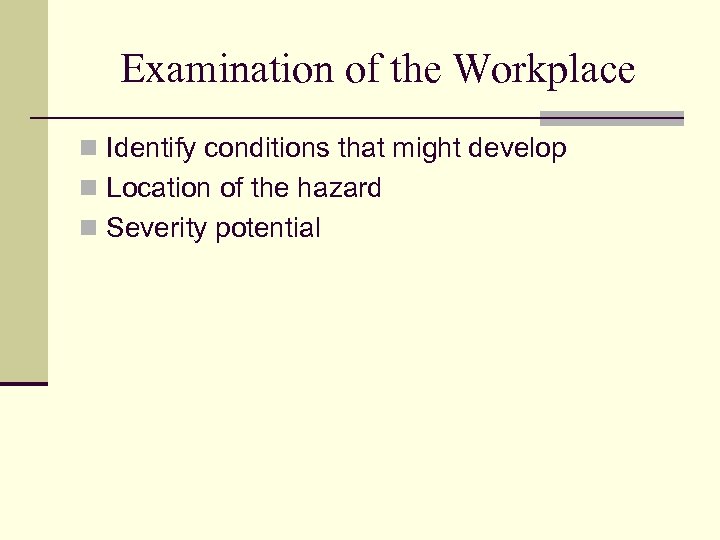 Examination of the Workplace n Identify conditions that might develop n Location of the hazard n Severity potential