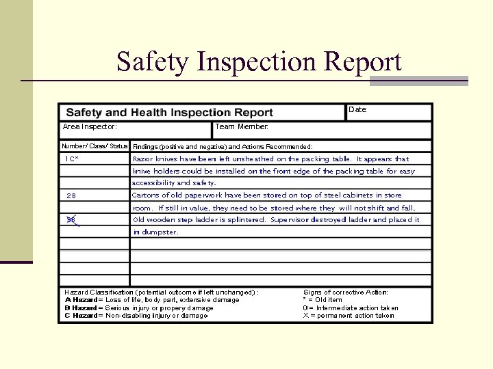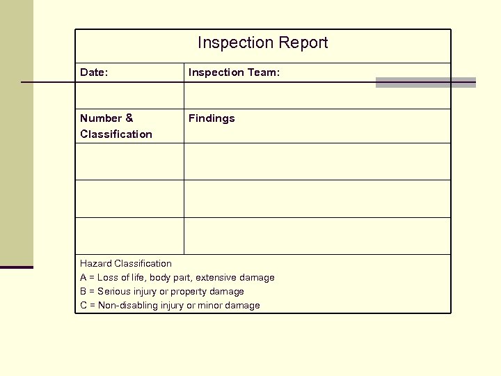 Inspection Report Date: Inspection Team: Number & Classification Findings Hazard Classification A = Loss of life, body part, extensive damage B = Serious injury or property damage C = Non-disabling injury or minor damage