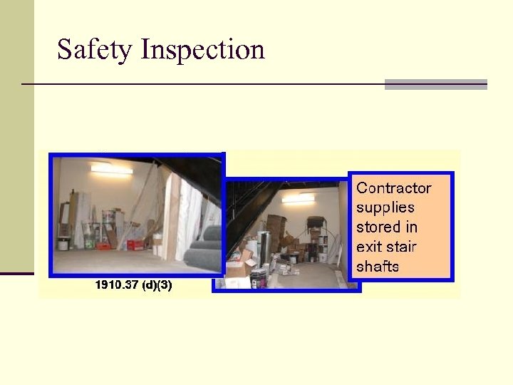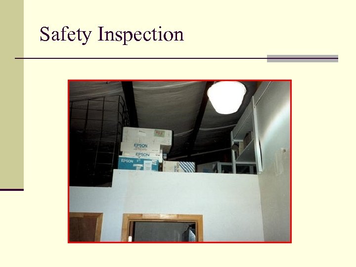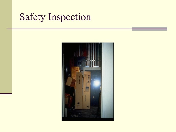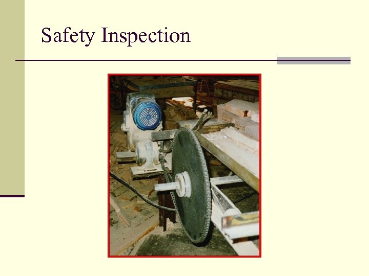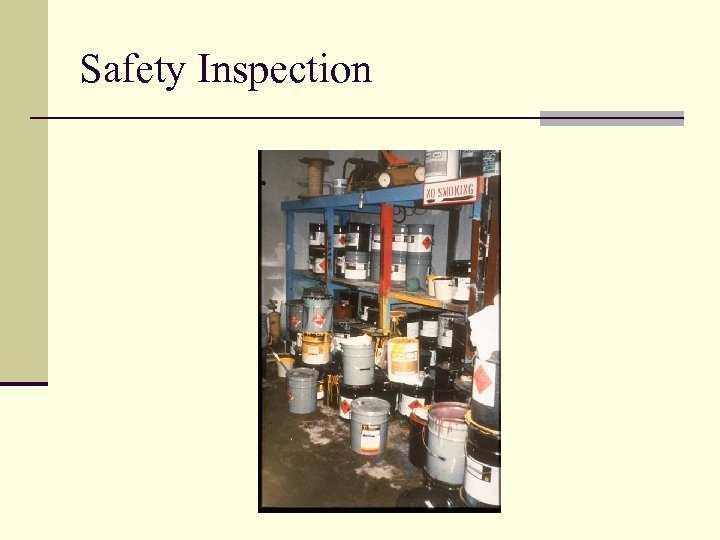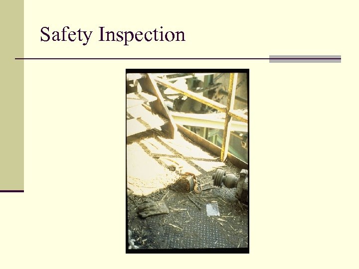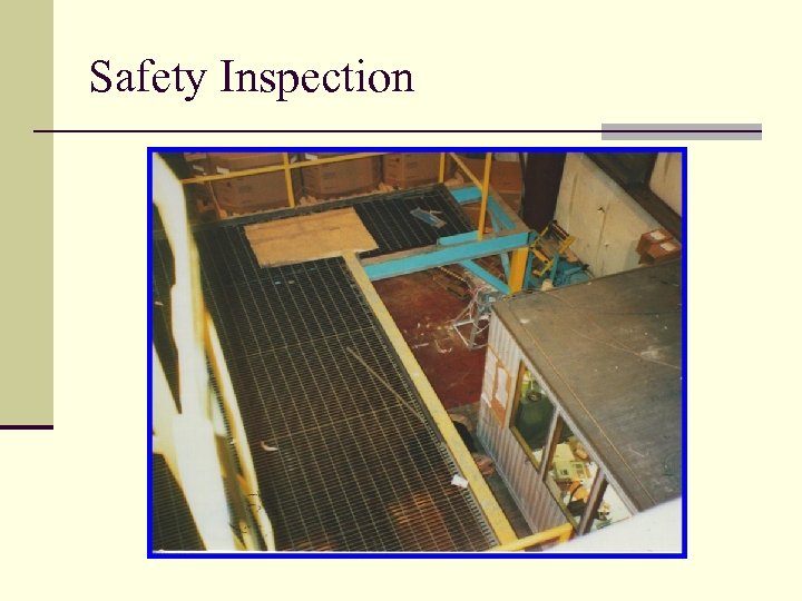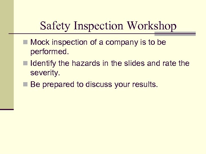 Safety Inspection Workshop n Mock inspection of a company is to be performed. n Identify the hazards in the slides and rate the severity. n Be prepared to discuss your results.