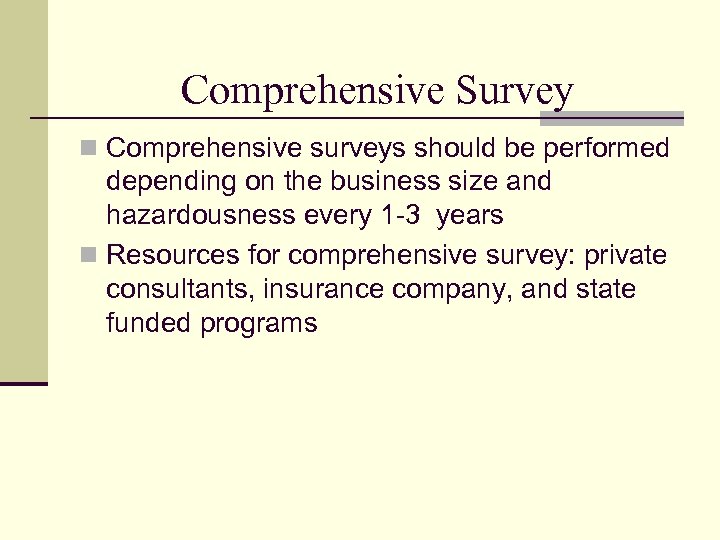Comprehensive Survey n Comprehensive surveys should be performed depending on the business size and hazardousness every 1 -3 years n Resources for comprehensive survey: private consultants, insurance company, and state funded programs