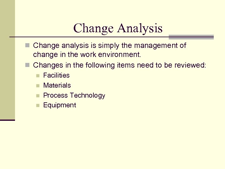 Change Analysis n Change analysis is simply the management of change in the work environment. n Changes in the following items need to be reviewed: n n Facilities Materials Process Technology Equipment