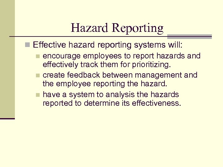 Hazard Reporting n Effective hazard reporting systems will: n encourage employees to report hazards and effectively track them for prioritizing. n create feedback between management and the employee reporting the hazard. n have a system to analysis the hazards reported to determine its effectiveness.