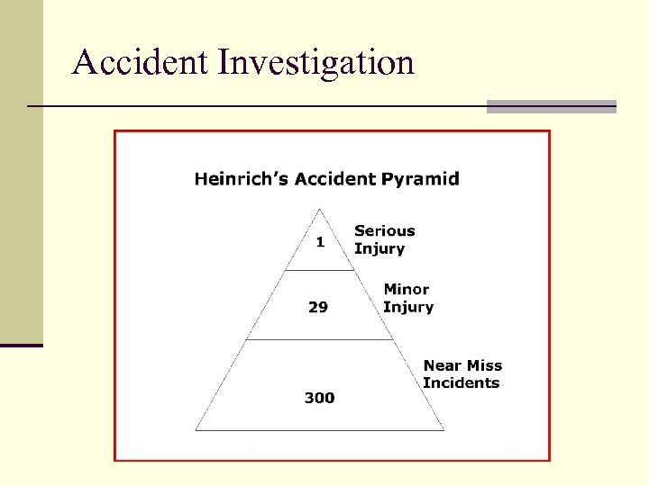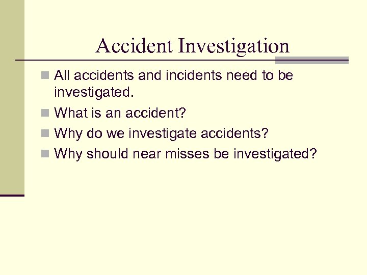 Accident Investigation n All accidents and incidents need to be investigated. n What is an accident? n Why do we investigate accidents? n Why should near misses be investigated?