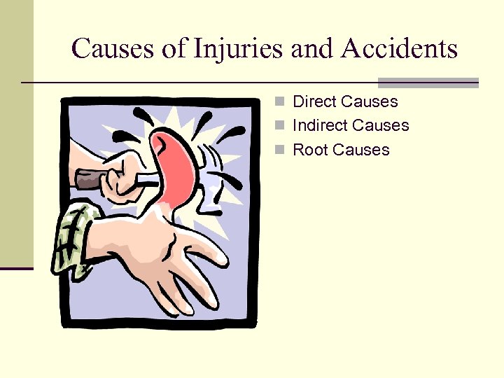 Causes of Injuries and Accidents n Direct Causes n Indirect Causes n Root Causes