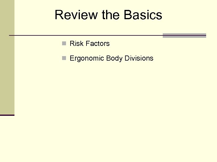 Review the Basics n Risk Factors n Ergonomic Body Divisions