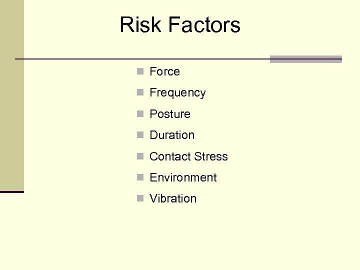 Risk Factors n Force n Frequency n Posture n Duration n Contact Stress n Environment n Vibration