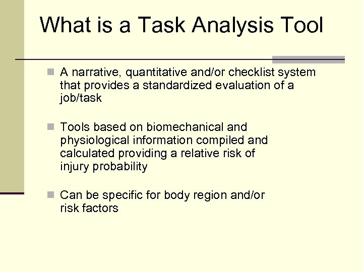 What is a Task Analysis Tool n A narrative, quantitative and/or checklist system that provides a standardized evaluation of a job/task n Tools based on biomechanical and physiological information compiled and calculated providing a relative risk of injury probability n Can be specific for body region and/or risk factors