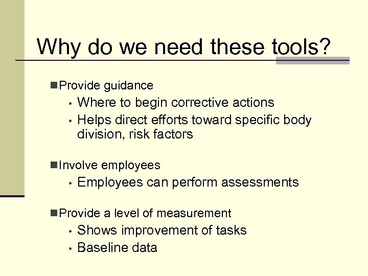 Why do we need these tools? n Provide guidance • • Where to begin corrective actions Helps direct efforts toward specific body division, risk factors n Involve employees • Employees can perform assessments n Provide a level of measurement • • Shows improvement of tasks Baseline data