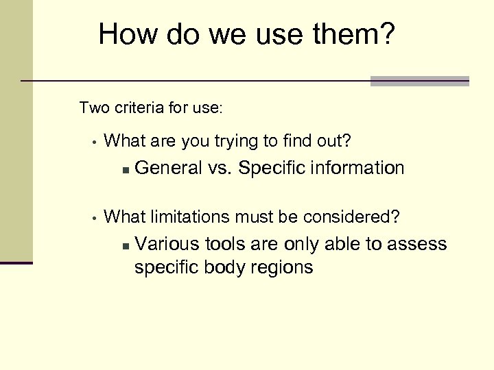 How do we use them? Two criteria for use: • What are you trying to find out? n • General vs. Specific information What limitations must be considered? n Various tools are only able to assess specific body regions