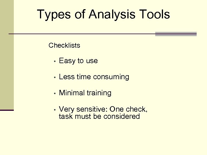 Types of Analysis Tools Checklists • Easy to use • Less time consuming • Minimal training • Very sensitive: One check, task must be considered