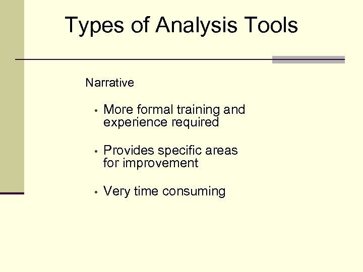 Types of Analysis Tools Narrative • More formal training and experience required • Provides specific areas for improvement • Very time consuming