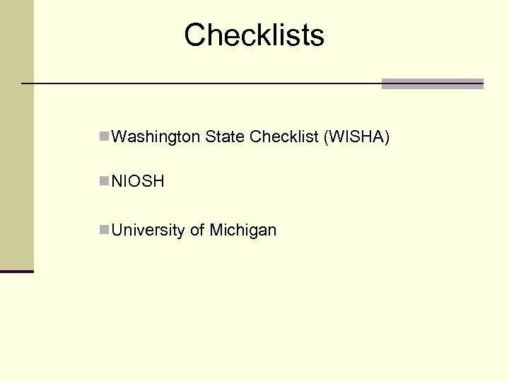 Checklists n Washington State Checklist (WISHA) n NIOSH n University of Michigan