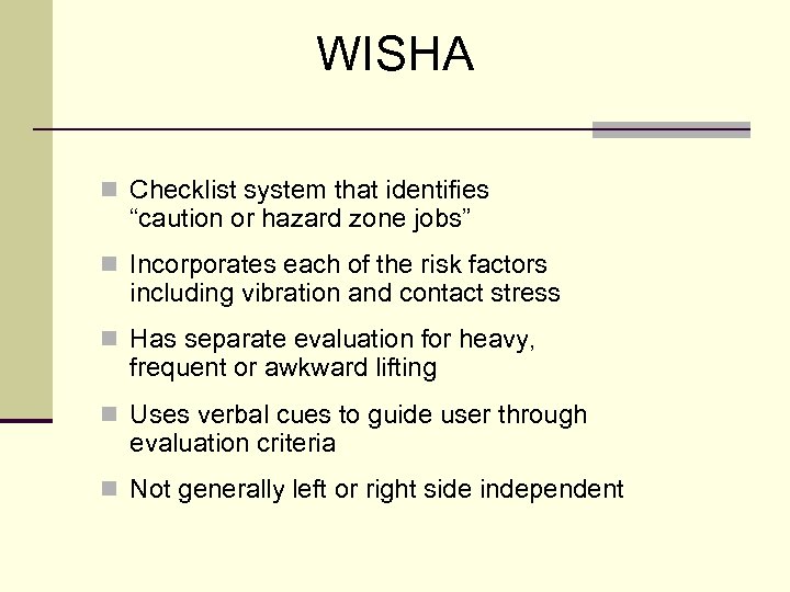 WISHA n Checklist system that identifies “caution or hazard zone jobs” n Incorporates each of the risk factors including vibration and contact stress n Has separate evaluation for heavy, frequent or awkward lifting n Uses verbal cues to guide user through evaluation criteria n Not generally left or right side independent