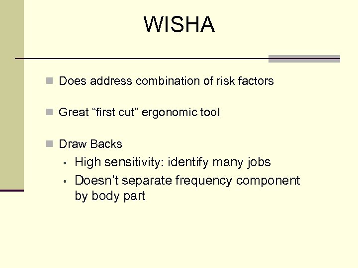 WISHA n Does address combination of risk factors n Great “first cut” ergonomic tool n Draw Backs • • High sensitivity: identify many jobs Doesn’t separate frequency component by body part