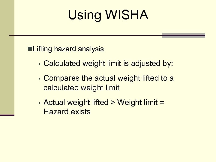 Using WISHA n Lifting hazard analysis • Calculated weight limit is adjusted by: • Compares the actual weight lifted to a calculated weight limit • Actual weight lifted > Weight limit = Hazard exists