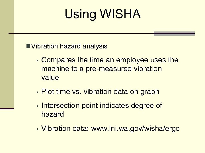 Using WISHA n Vibration hazard analysis • Compares the time an employee uses the machine to a pre-measured vibration value • Plot time vs. vibration data on graph • Intersection point indicates degree of hazard • Vibration data: www. lni. wa. gov/wisha/ergo
