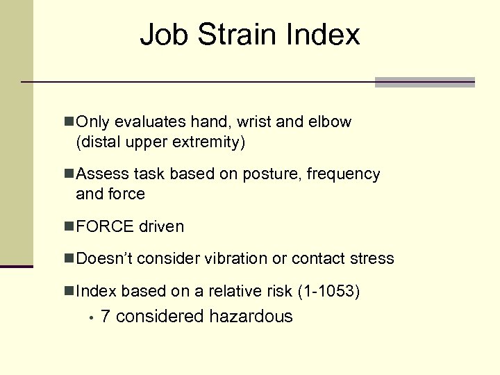 Job Strain Index n Only evaluates hand, wrist and elbow (distal upper extremity) n Assess task based on posture, frequency and force n FORCE driven n Doesn’t consider vibration or contact stress n Index based on a relative risk (1 -1053) • 7 considered hazardous