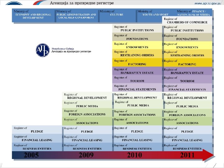 Registers operated by SBRA Agencija za privredne registre – APR (Serbian) or SBRA (Serbian Business Registers Agency) Until 2009, SBRA operated 3 registres: - Register of Business entities (Companies and Entrepreneurs); - Register of Pledges on movable assets and rights (Collateral Registry); - Register of Financial leasing From October, 2009 to January, 2010 five more registers started - Register of Associations (NGO) and Register of Foreign associations; - Register of Public Media; - Register of Financial statements and Data on solvency; - Register of Tourism, with number of sub-registers. Until the end of 2010, and in the first half of 2011, number of new registers will be started: *Register of Bankruptcy estate; *Register of Regional development measures and Incentives; *Register of restraining orders; *Register of Sports Associations; *Register of Institutions; *Register of Chambers of Commerce; etc. (more than 20 registers expected until 2011)