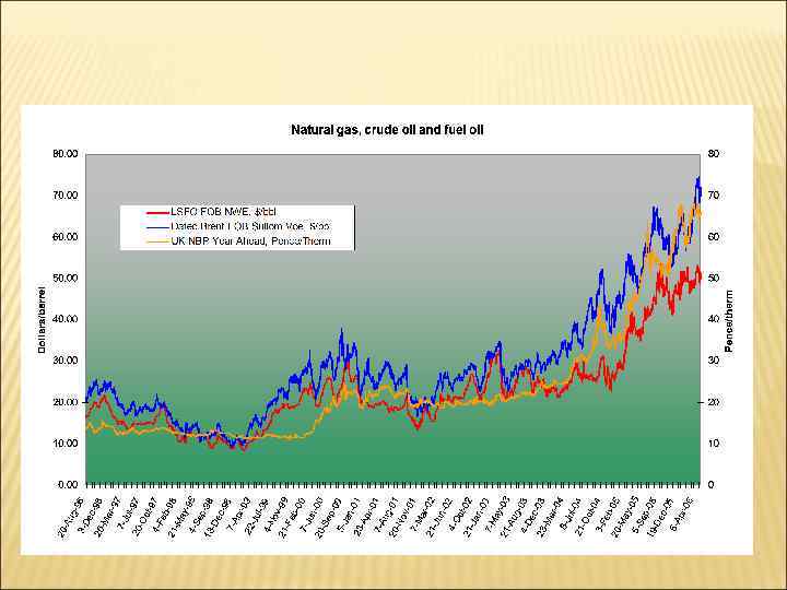 Plurality of Prices in the World Oil Market (US$/barrel) $/bbl Brent WTI Urals Mars 2002 25, 02 26, 16 23, 8 23, 68 2003 28, 83 31, 07 27, 47 2004 38, 27 41, 49 34, 13 35, 31 2005 54, 52 58, 59 50, 32 50, 13 2006 65, 14 66, 02 61, 22 58, 90 2007 72, 39 72, 20 69, 18 66, 58 2008 97, 26 100, 06 94, 83 93, 95 2009 61, 67 61, 92 61, 15 60, 50 2010 79, 45 78, 26 120 78, 08 79, 5 100 80 60 40 20 0 2, 002 Source BP 2, 003 2, 004 2, 005 2, 006 2, 007 2, 008 2, 009 2, 010