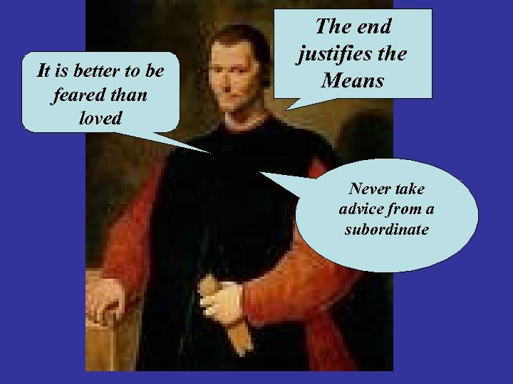 It is better to be feared than loved The end justifies the Means Never take advice from a subordinate