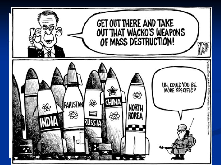 Weapons of Mass Destruction These include nuclear, chemical and biological weapons that can kill thousands, even millions of people. The search for these led to the invasion of Iraq in 2002, but none were found.