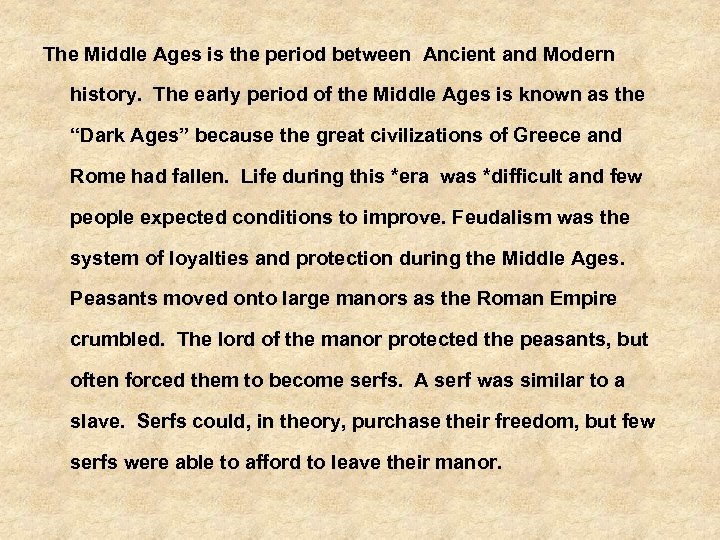 The Middle Ages is the period between Ancient and Modern history. The early period of the Middle Ages is known as the “Dark Ages” because the great civilizations of Greece and Rome had fallen. Life during this *era was *difficult and few people expected conditions to improve. Feudalism was the system of loyalties and protection during the Middle Ages. Peasants moved onto large manors as the Roman Empire crumbled. The lord of the manor protected the peasants, but often forced them to become serfs. A serf was similar to a slave. Serfs could, in theory, purchase their freedom, but few serfs were able to afford to leave their manor.
