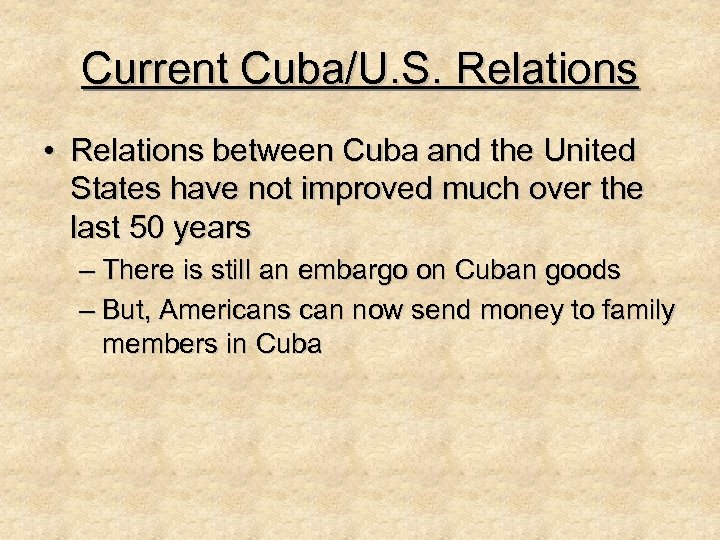 Current Cuba/U. S. Relations • Relations between Cuba and the United States have not improved much over the last 50 years – There is still an embargo on Cuban goods – But, Americans can now send money to family members in Cuba