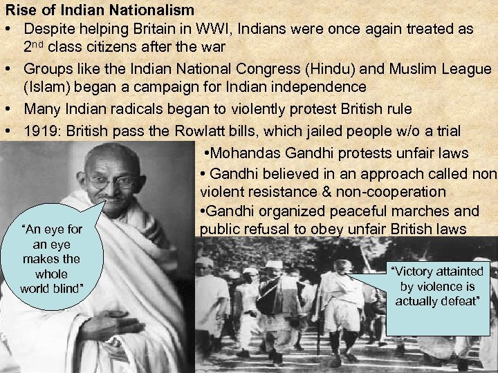 Rise of Indian Nationalism • Despite helping Britain in WWI, Indians were once again treated as 2 nd class citizens after the war • Groups like the Indian National Congress (Hindu) and Muslim League (Islam) began a campaign for Indian independence • Many Indian radicals began to violently protest British rule • 1919: British pass the Rowlatt bills, which jailed people w/o a trial • Mohandas Gandhi protests unfair laws • Gandhi believed in an approach called nonviolent resistance & non-cooperation • Gandhi organized peaceful marches and “An eye for public refusal to obey unfair British laws an eye makes the whole world blind” “Victory attainted by violence is actually defeat”